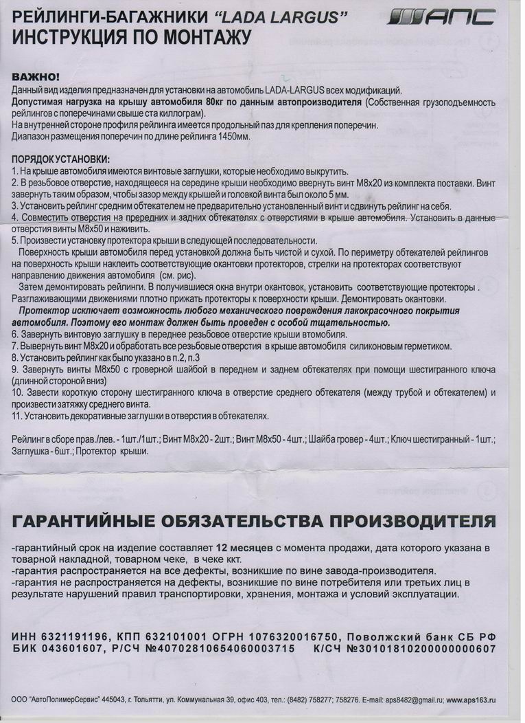Друзья, кому интересно, присмотритесь к рейлингам, как сообщается на сайте поставщика, они подходят для ларгуса. http://tolyatti.tiu.ru/p7565117-lada-largus-2012g.html Сайт компании поставщика: http://avto-zapchast.net/ Если нужно пригласим их в наши партнеры. Допшоп клубный сервис Лада Ларгус в СПБ Передовиков д 8 А Тел 8921 773 33 04 | ||||||||||||||||||