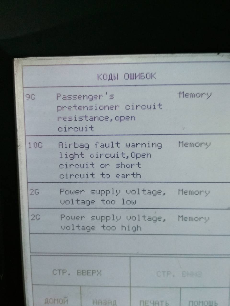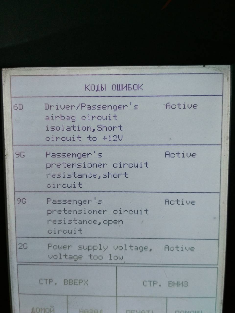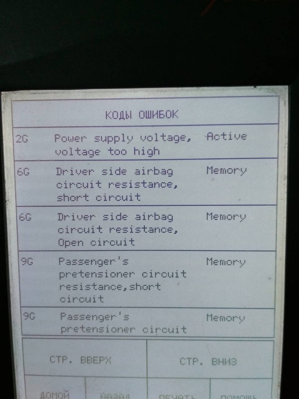 Всем форумчанам привет. У меня вопрос ко всем разбирающимся. В том году была авария, въехал мне один джигит в переднее левое колесо(стойка, крыло, бампер, фара, радиатор заменили), вытянули, покрасили. При аварии подушки безопасности не сработали. Осталась гореть иконка подушки безопасности водителя. Поехал к официалам, они посмотрели, сказали что нужно менять блок управления подушек безопасности. Помятуя о "классности" наших официалов, поехал к знакомому у которого есть всё для диагностики. Он посмотрел и сказал, что замена эбу подушек ничего не даст,нужно менять все подушки и водителя и пассажира, а так же в преднатяжителях что то(я в этом слабо понимаю),этому человеку я доверяю, но он не на ларгусах специализируется, по этому решил спросить у всех Вас, может быть какая то своя особенность есть именно в ларгусах. Ниже выложу все ошибки которые вылезли. Если подушки остались целыми нельзя ли поменять что то в управлении этими подушками? Если обе подушки накрылись, то почему на панели приборов не загорелась подушка безопасности пассажира? Ну короче хотелось бы узнать про все варианты, которые помогут съэкономить бюджет(отключение подушек не рассматриваю). Прикрепленные файлы: