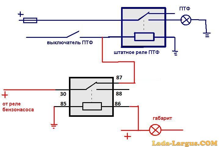 samsa, На приведенной выше схеме все правильно нарисовано и написано. По схеме именно 87! А на корпусах реле Х.З. что написано. Кто маломальски разбирается в электрике сам додумает что куда присоединить. А если познаний нет нехрен туда соваться. Короче, идея понятная? В путь! Только предупреждаю: НЕЛЬЗЯ ВКЛЮЧАТЬ ПЕРЕКЛЮЧАТЕЛЬ ПТФ ПРИ ВЫКЛЮЧЕНОМ ПЕРЕКЛЮЧАТЕЛЕ ГАБАРИТАХ(т.е. включать уже включенные ПТФ). Обратный ток через переключатель сводит с ума дополнительное реле(включ-выкл с огромн. количеством циклов). Можно поставить диод в цепь. Куда, не знаю! Здесь спецов полно, нарисуют. | ||||||||