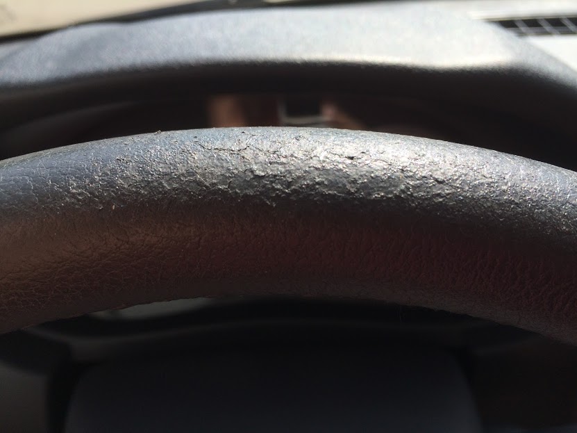 Странная ерунда с кожей на руле (кусок сантиметров 10, на 12 часов), причем в местах наименьшего износа, т.к. руки обычно держу на 10 и 14 часов. Возможно от солнца?