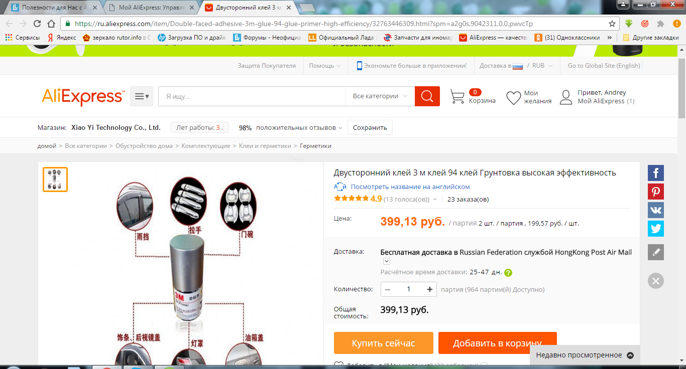 Shurik43, Я в наших автомагазинах спрашивал,некоторые продавцы даже не знают что это такое, предлагали просто растворитель. https://ru.aliexpress.com/item/Double-faced-adhesive-3m-glue-94-glue-primer-high-efficiency/32763446309.html?spm=a2g0s.9042311.0.0.mv07SR Вот ссылка. Ломайся, но не гнись!В изломе- смерть,в изгибе-подлость. | ||||||