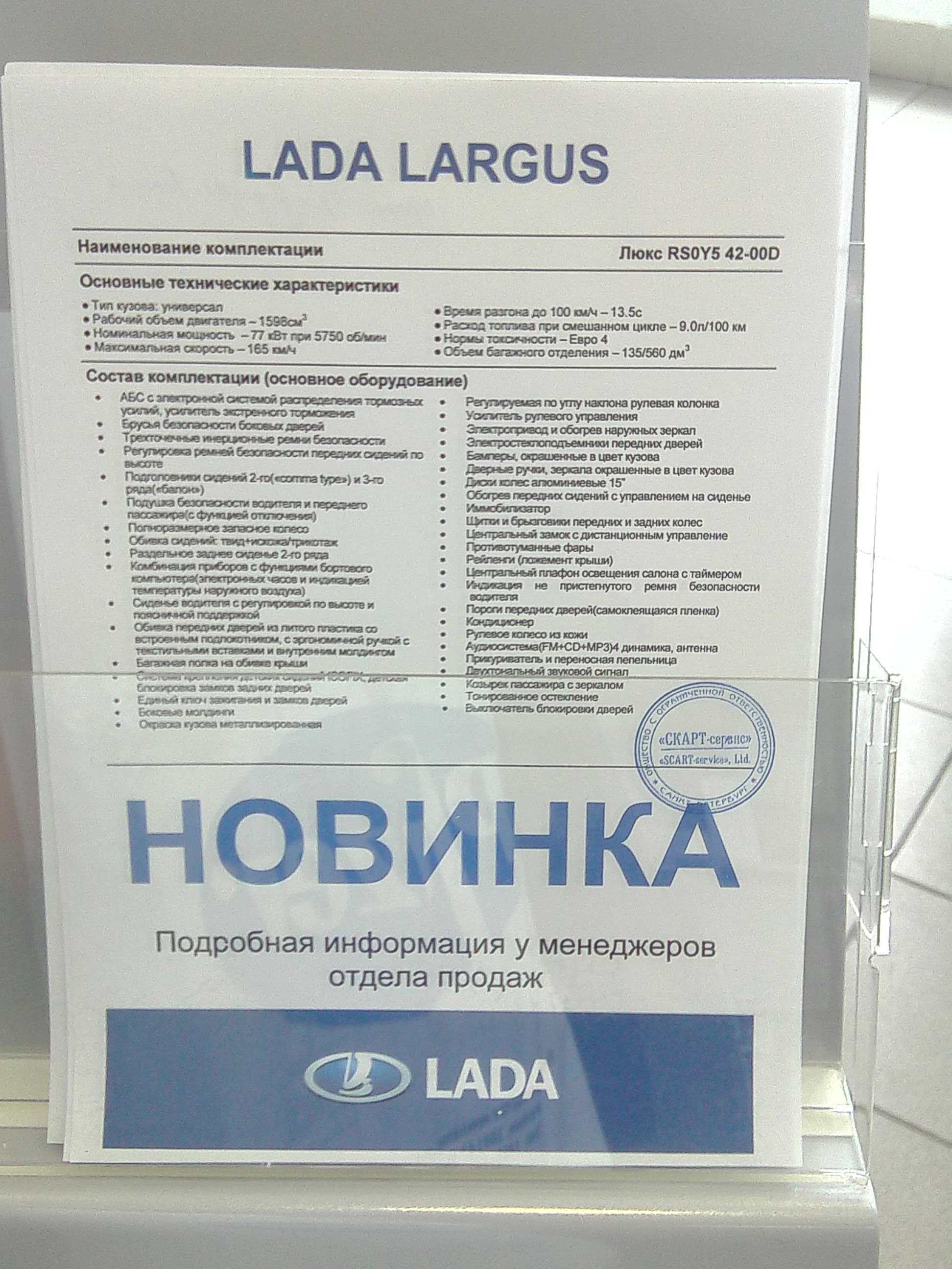 Решил поинтересоваться условиями покупки и сроками поставок. Короче, Скарт планирует в скором времени официальную презентацию. А то авто, который я осмотрел в салоне - тестовый. На счёт сроков ясности у специалистов пока нет, но от души пообщались по комплектации доп. оборудованием. А условия покупки были Скартом, как нашим партнёром, выложены на сайте клуба тут: http://largusladaclub.ru/forum/thread206.html. Начальные условия мной были выполнены.