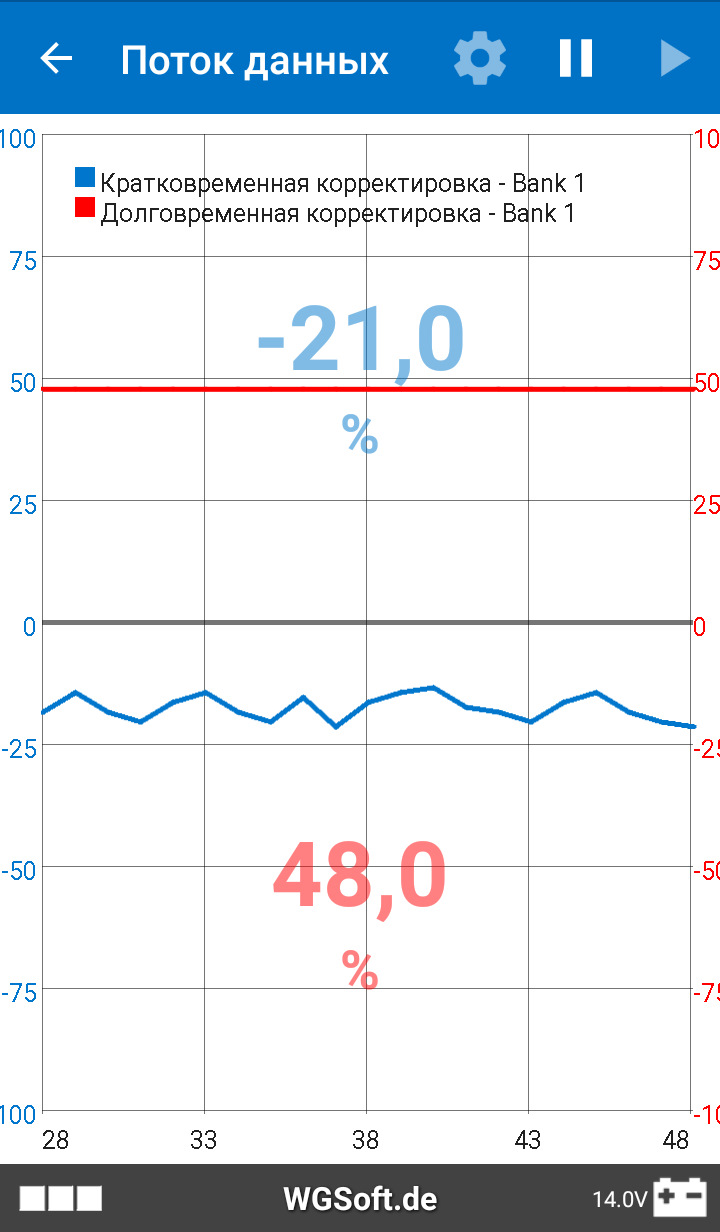 Всем доброго дня. При диагностике через ELM327 (разными программами) получены следующие данные по коррекции подачи топлива: кратковременная коррекция варьируется в районе -25%, долговременная коррекция постоянно +48%. От режима работы двигателя и его прогрева показания не зависят. Ошибок по коррекции нет. Показания первого кислородника в норме. Других ошибок сейчас нет (была P0304, заменил свечи, уплотнительное кольцо на впуске, клапан ХХ, ошибка ушла). Вопрос: никто не сталкивался с такими цифрами? Что это может значить — ЭБУ неверно выдаёт данные или двигатель работает не в штатном режиме? Спасибо. Прикрепленные файлы: