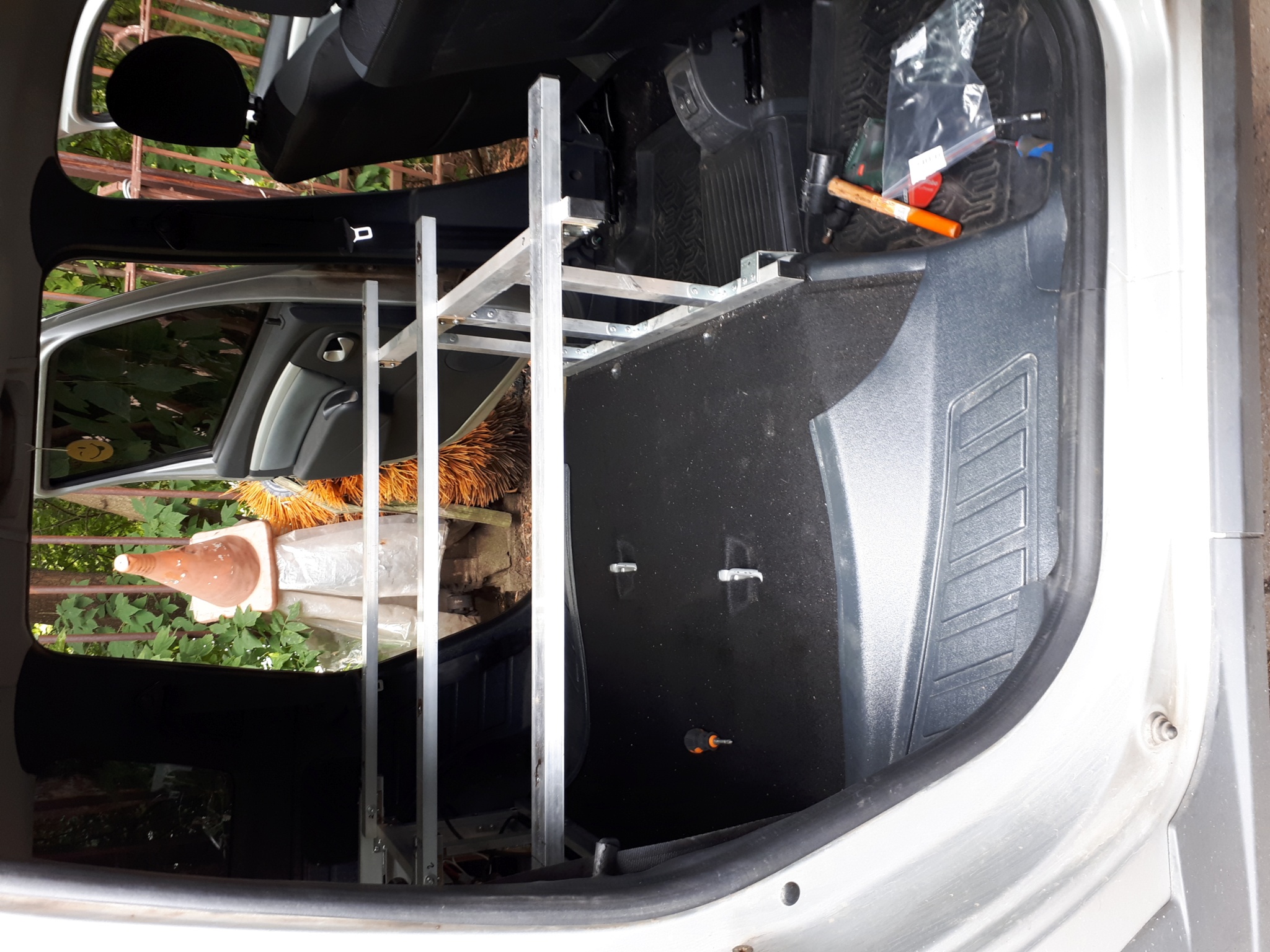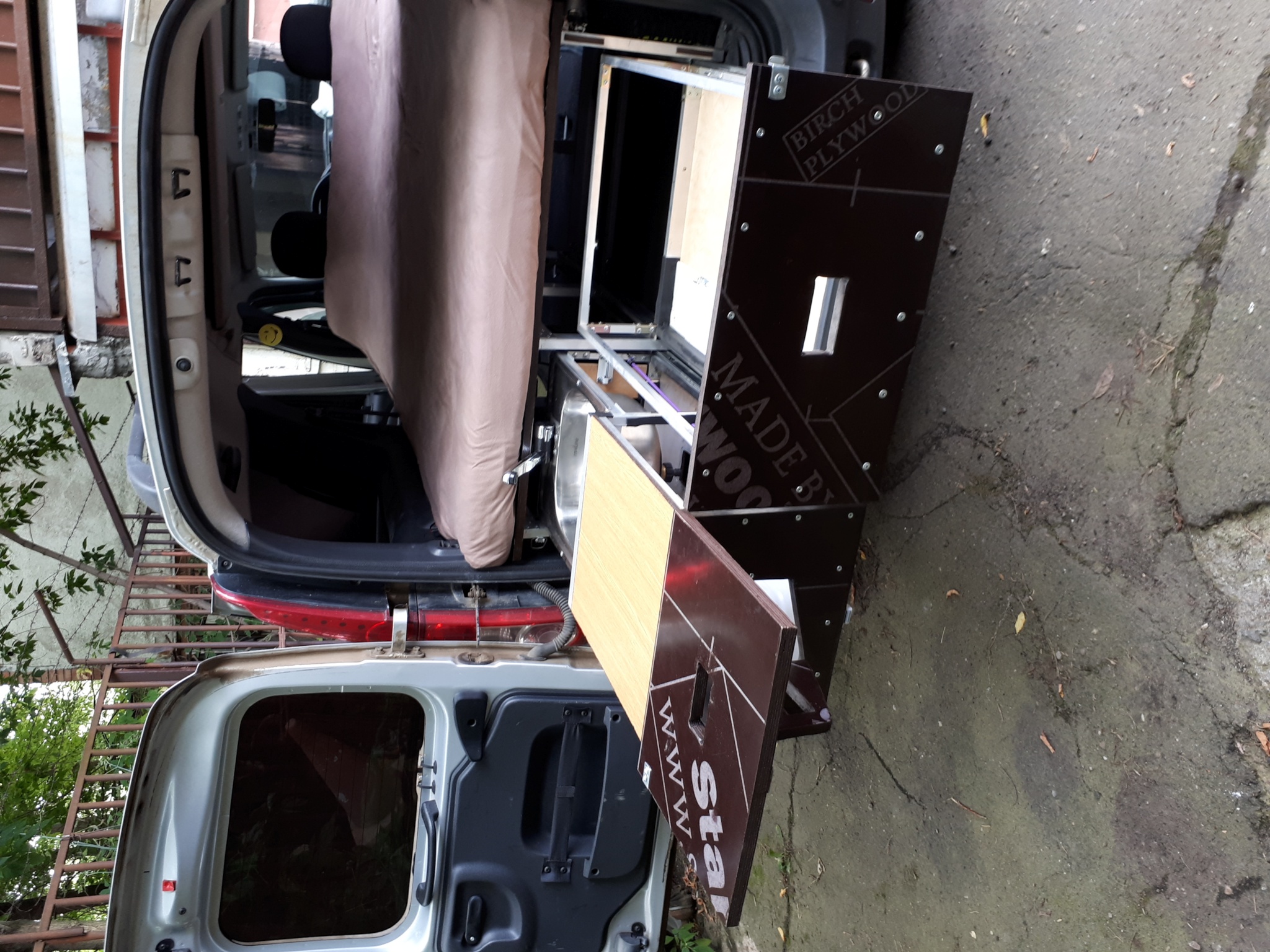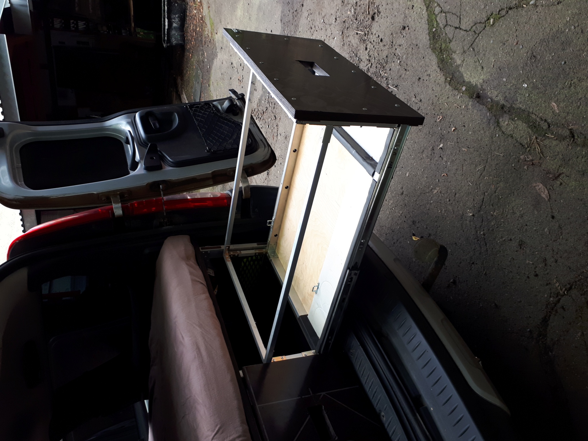 Вся конструкция сделана из Ал-профилей из Леруа и собрана на заклепках. За счет этого вся железная часть получилась лёгкая, приблизительно 25 кг. + фанера ламинированная 18 мм (ещё 30 кг), итого прибл 55 кг. Так что, в принципе, можно её вообще не вынимать и просто постоянно возить в авто. Задний кухонный бокс с фанерой по длине доходит как раз до задних сидений, так что можно сделать ещё и "быстро-походный" вариант выходного дня: задние сиденья не снимать, а просто их складывать и использовать низкую подставку под направляющие кровати поверх задних сидений. Тогда просто места под барахло будет меньше. Это было у меня в планах, но не успел. Вся конструкция крепится внутри салона на родной крепёж (видно на фото): кухонный бокс - на болты крепления петель для груза, подставка под направляющие кровати - на болты крепления задних сидений. Кузов дополнительно нигде не сверлится!!! Стоит абсолютно мёртво, выдержит слона.