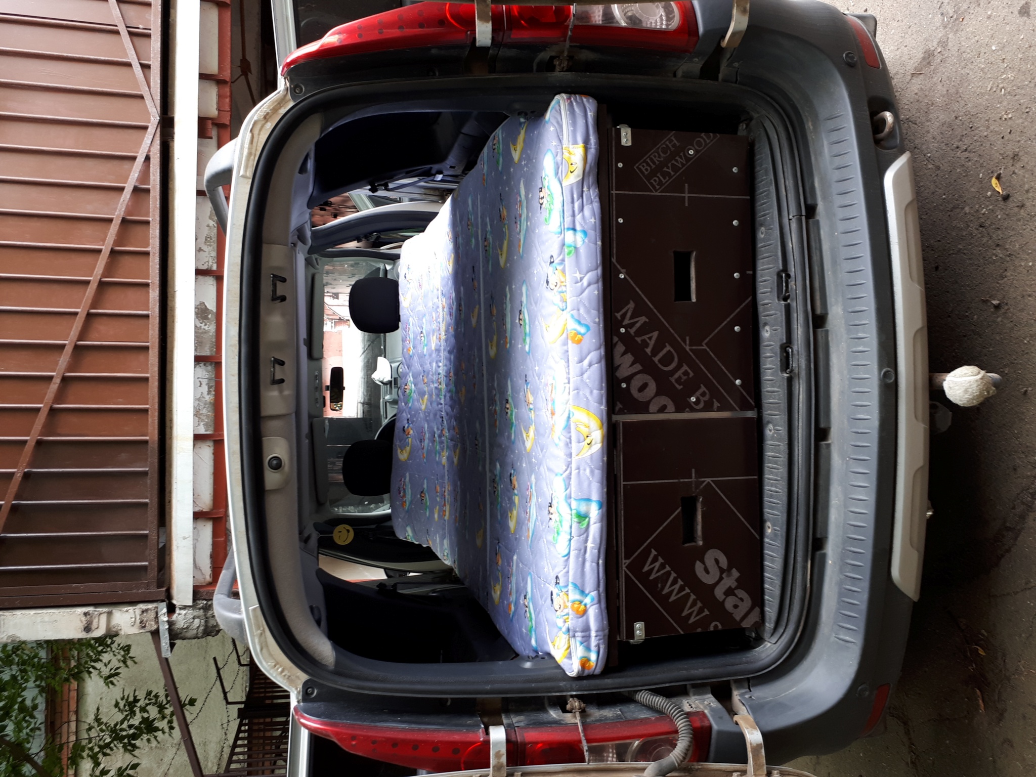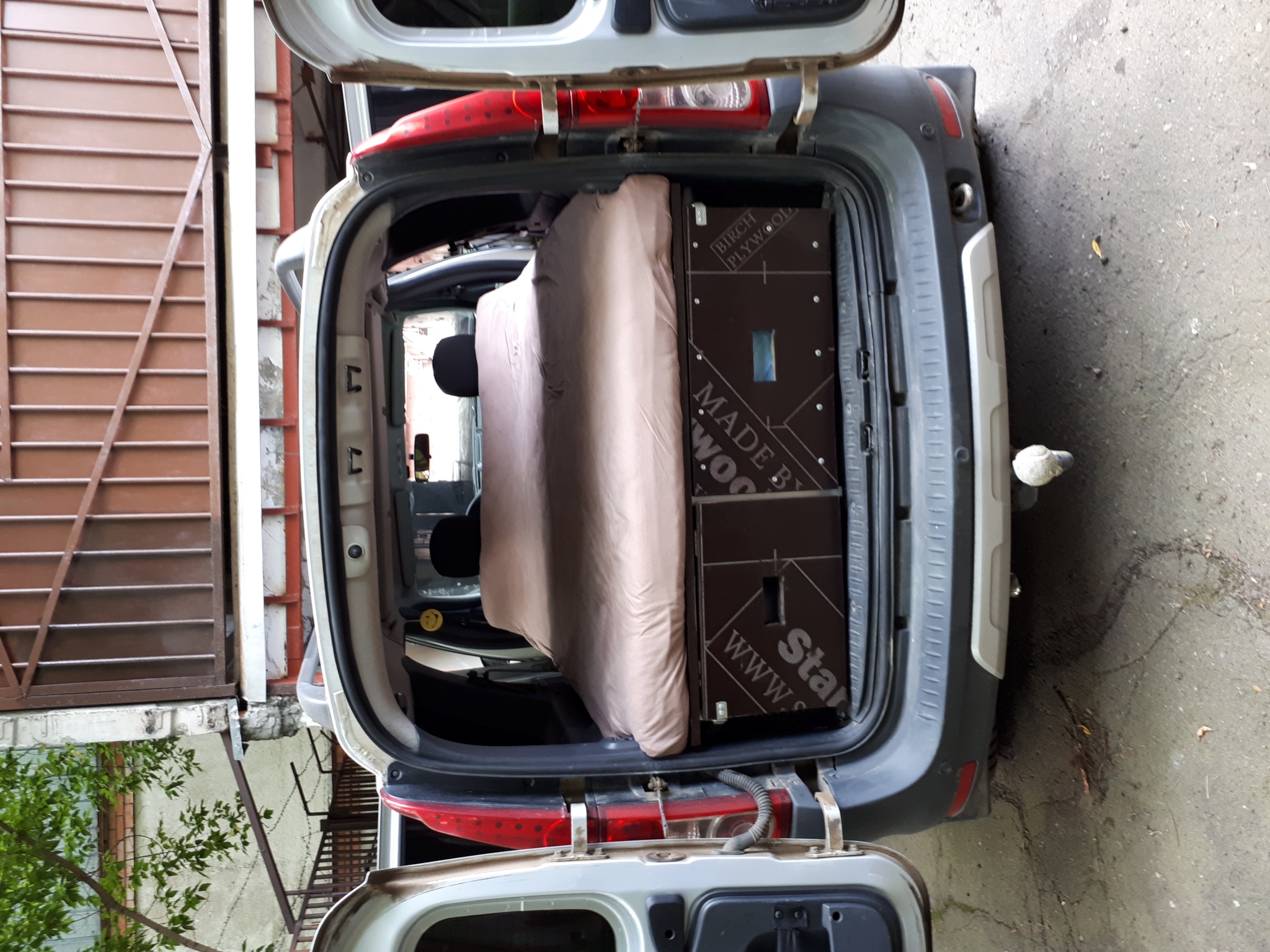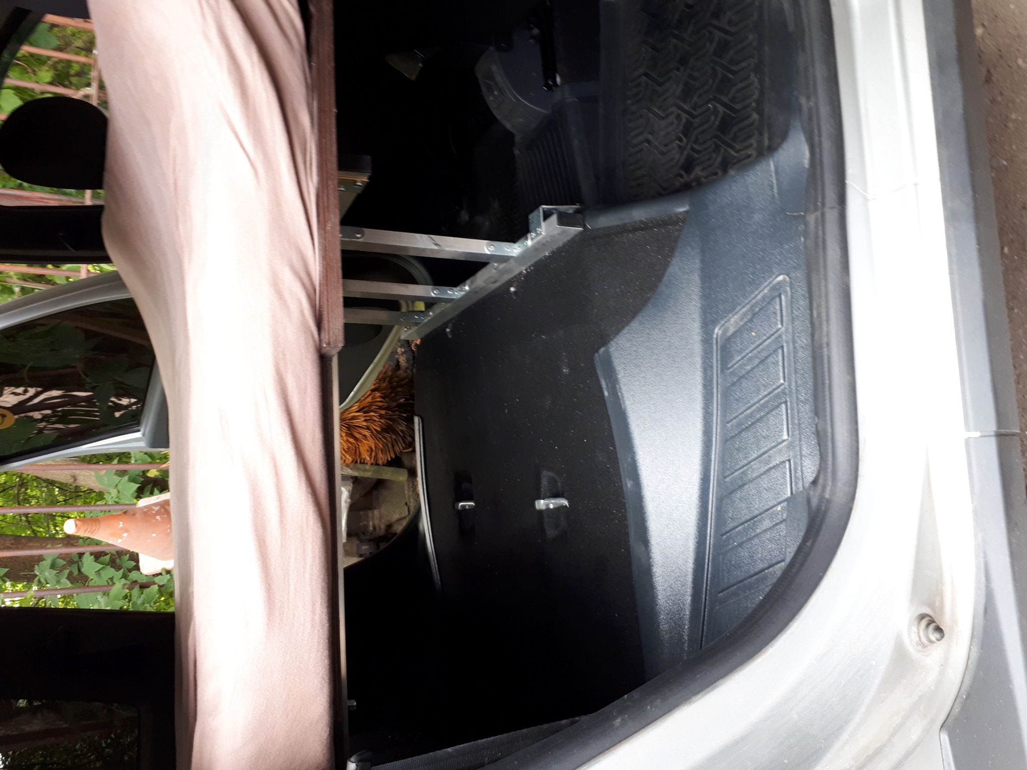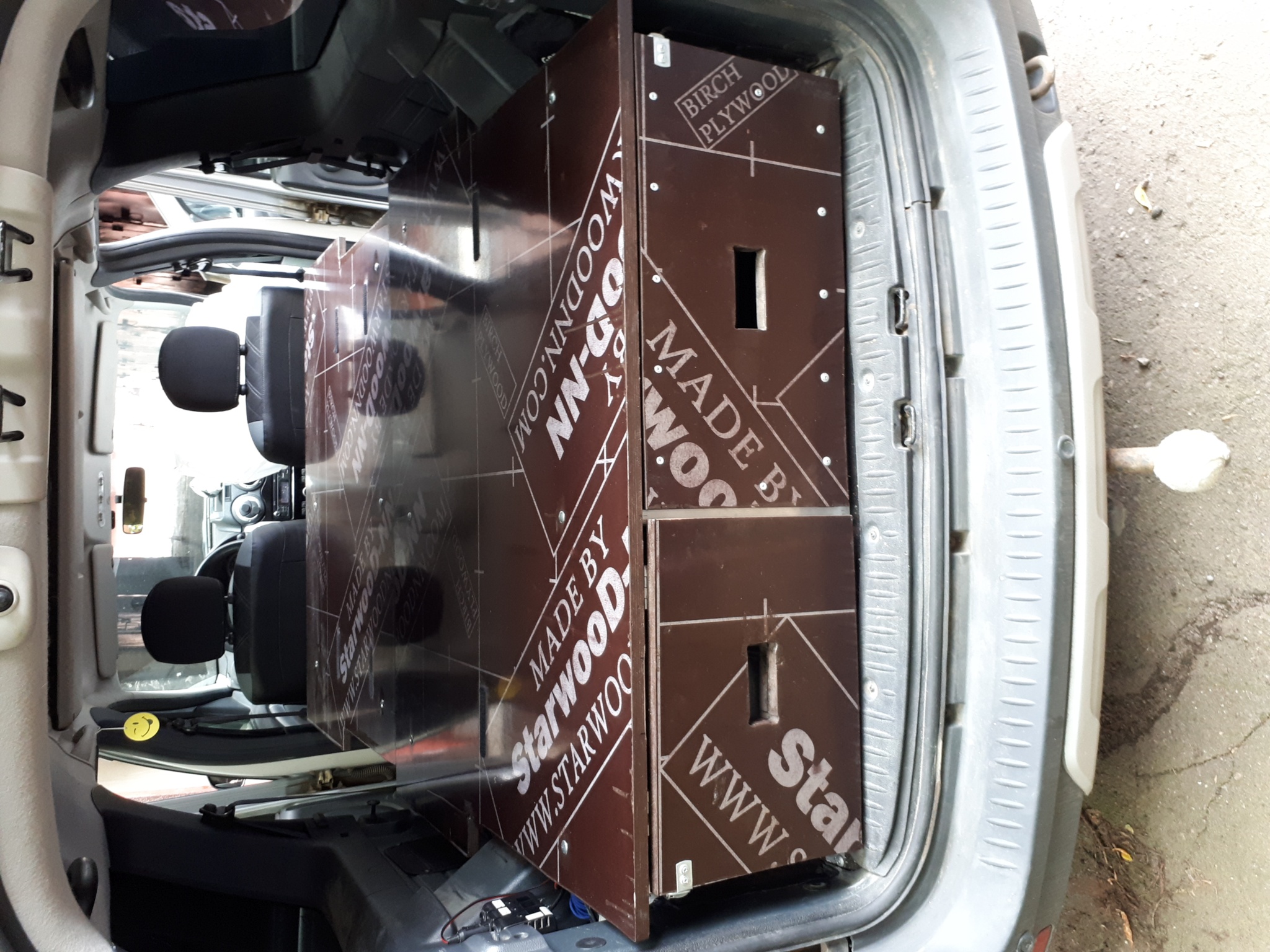 Вся конструкция сделана из Ал-профилей из Леруа и собрана на заклепках. За счет этого вся железная часть получилась лёгкая, приблизительно 25 кг. + фанера ламинированная 18 мм (ещё 30 кг), итого прибл 55 кг. Так что, в принципе, можно её вообще не вынимать и просто постоянно возить в авто. Задний кухонный бокс с фанерой по длине доходит как раз до задних сидений, так что можно сделать ещё и "быстро-походный" вариант выходного дня: задние сиденья не снимать, а просто их складывать и использовать низкую подставку под направляющие кровати поверх задних сидений. Тогда просто места под барахло будет меньше. Это было у меня в планах, но не успел. Вся конструкция крепится внутри салона на родной крепёж (видно на фото): кухонный бокс - на болты крепления петель для груза, подставка под направляющие кровати - на болты крепления задних сидений. Кузов дополнительно нигде не сверлится!!! Стоит абсолютно мёртво, выдержит слона.