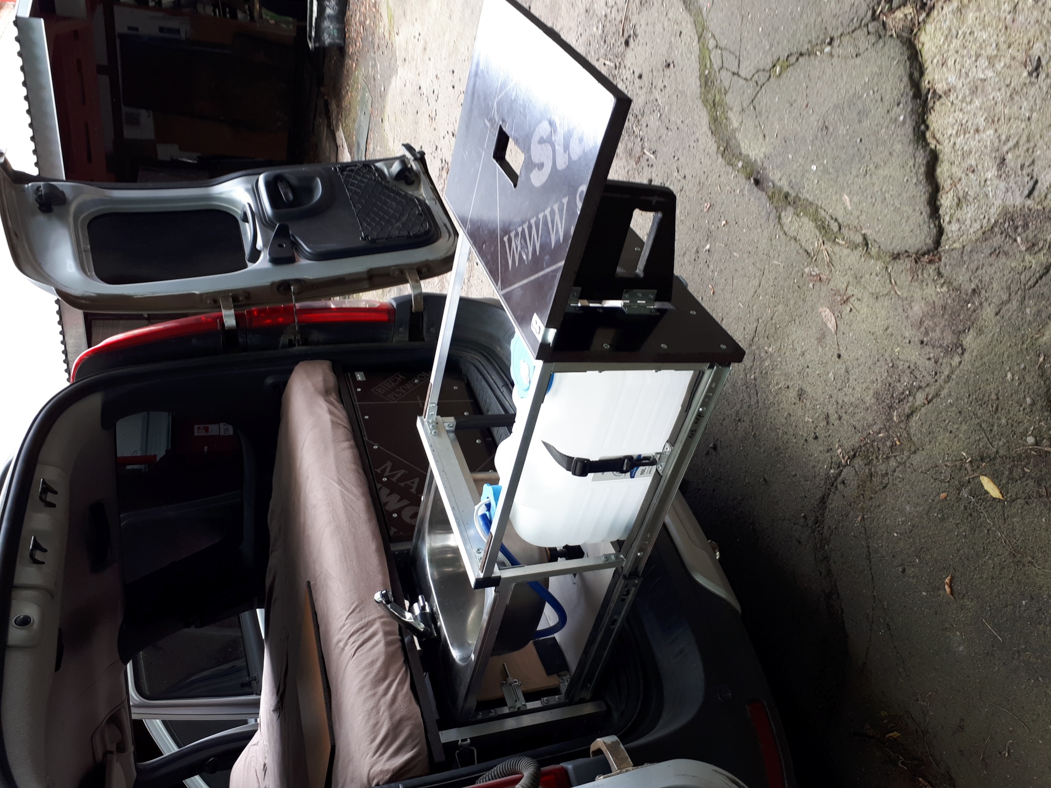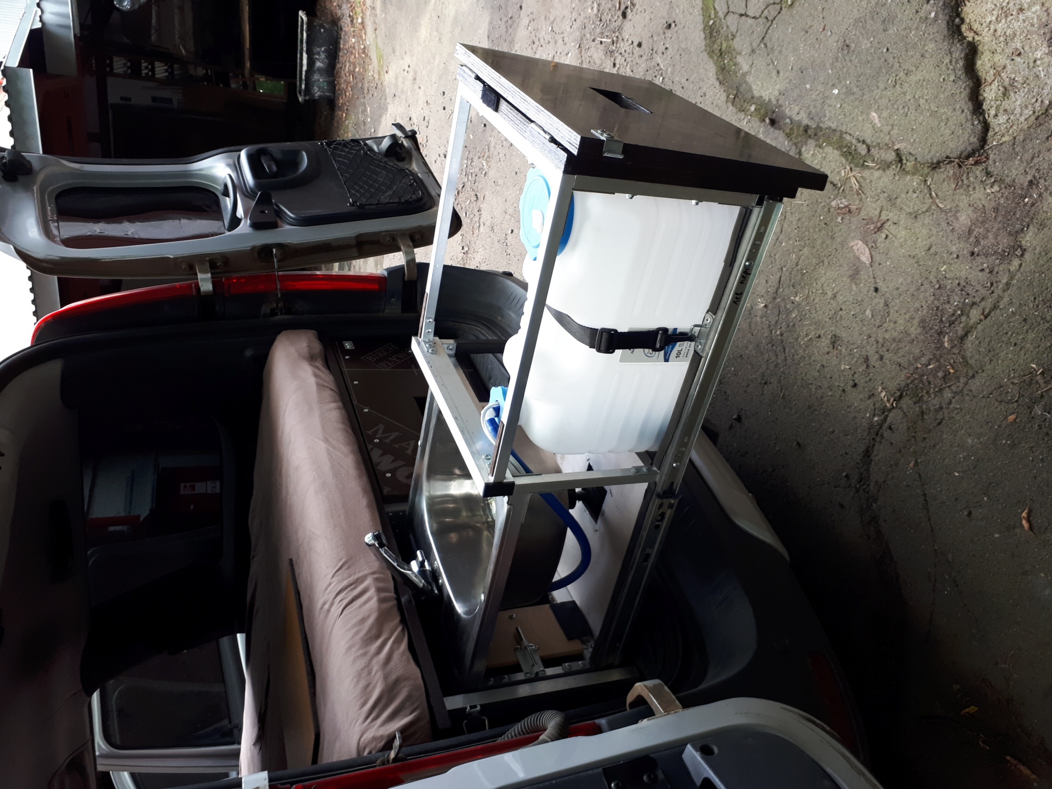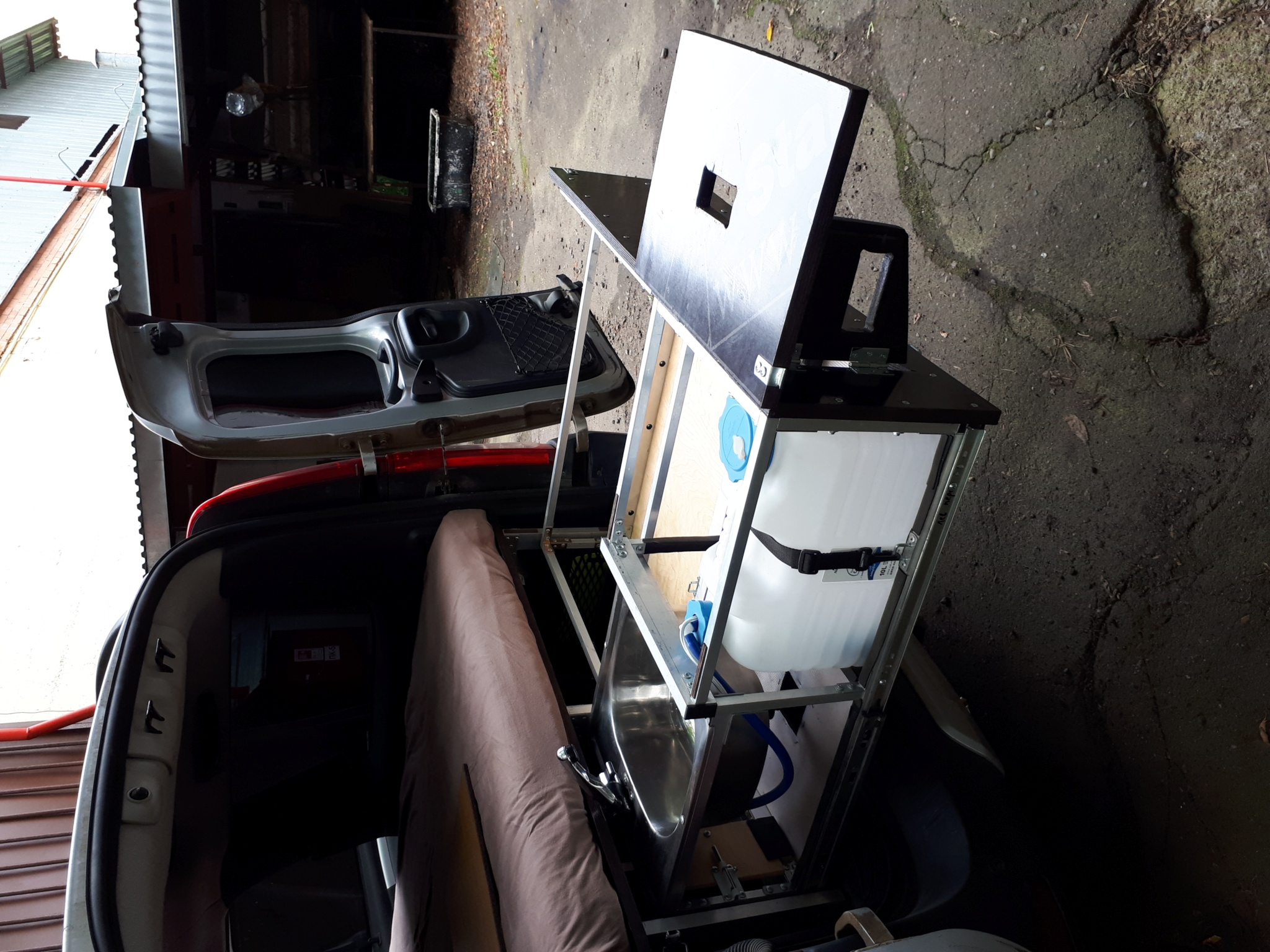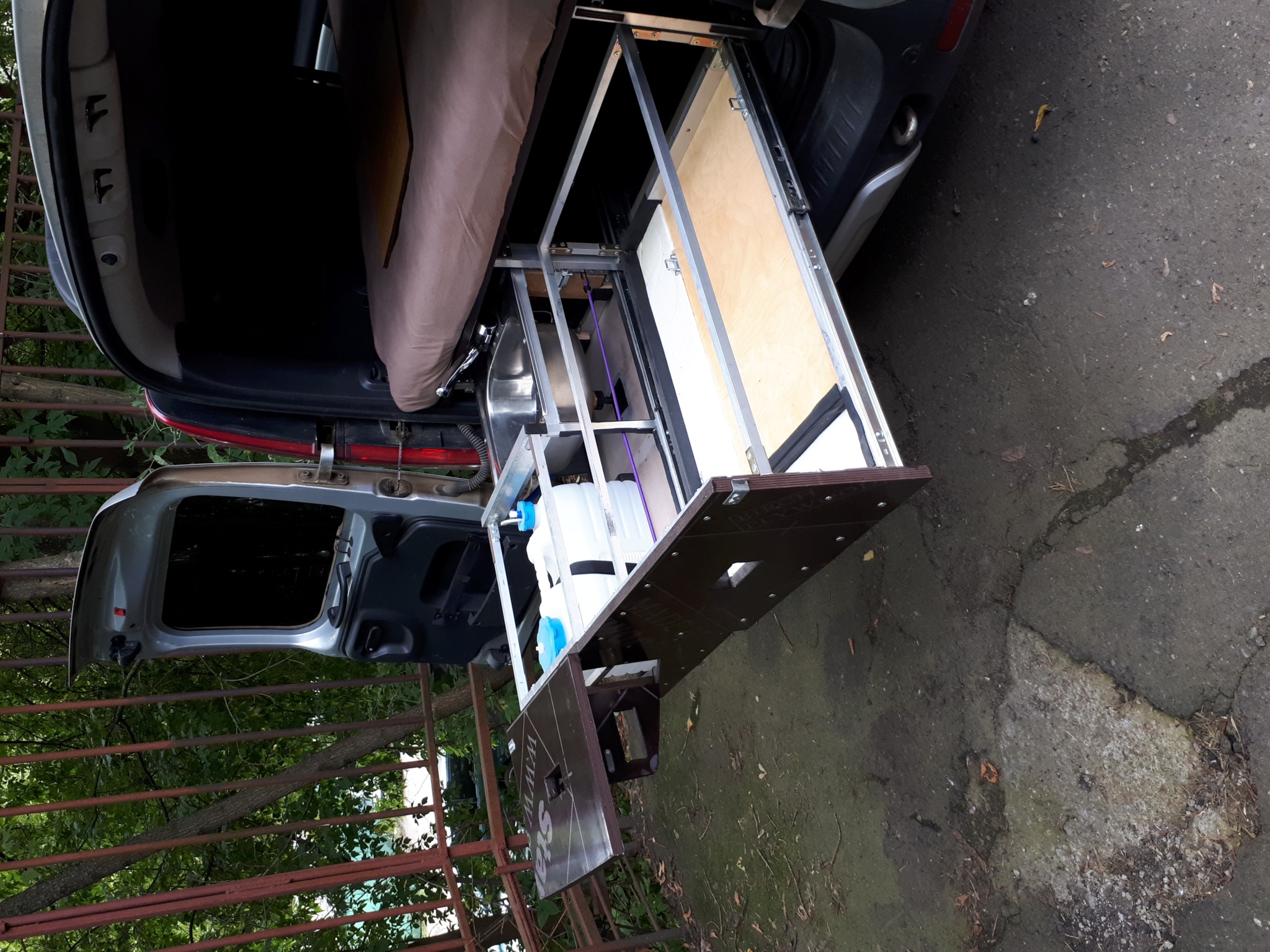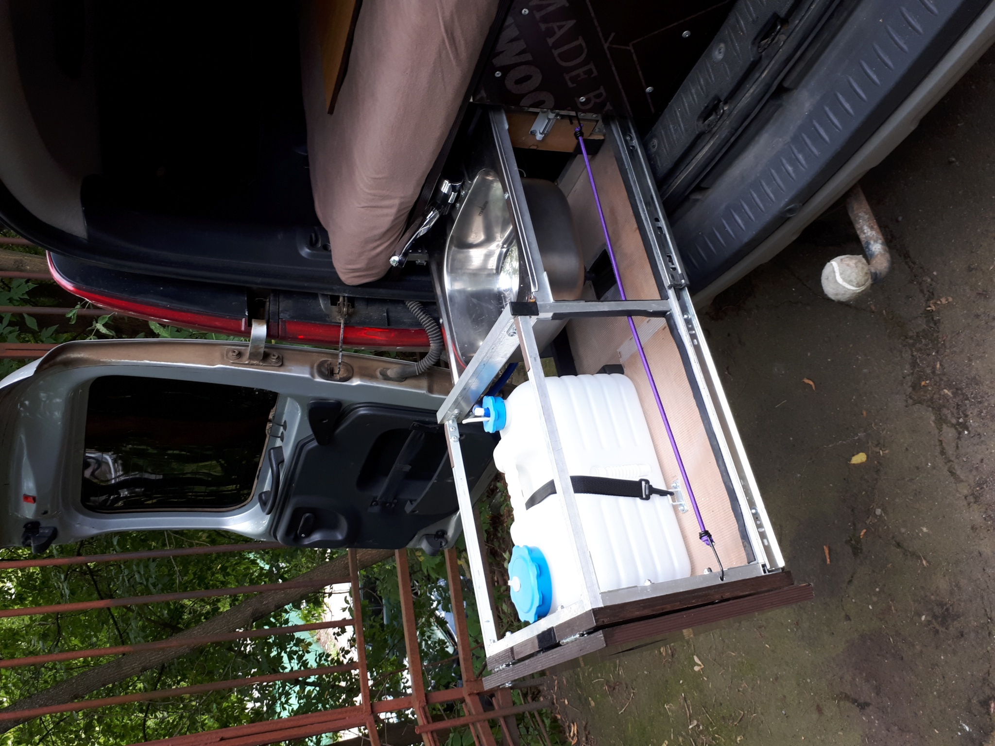 В левом ящике: мойка 38х38, складной кемперный кран с автоматическим включением при открывании, канистра 10 литров и погружной насос в ней, который управляется микриком в кране + съёмная полочка над канистрой под газ плитку + откидной столик в самом торце. Насос с краном запитываются от стандартного штекера в прикуриватель. Вокруг канистры и под мойкой еще полно места для хранения посуды и всякой всячины. Левый ящик фиксируется в выдвинутом состоянии двумя задвижками, стоит мёртво. Слив из мойки через шланг с быстросъемным соединителем (типа садового) или на землю или в канистру для серой воды.